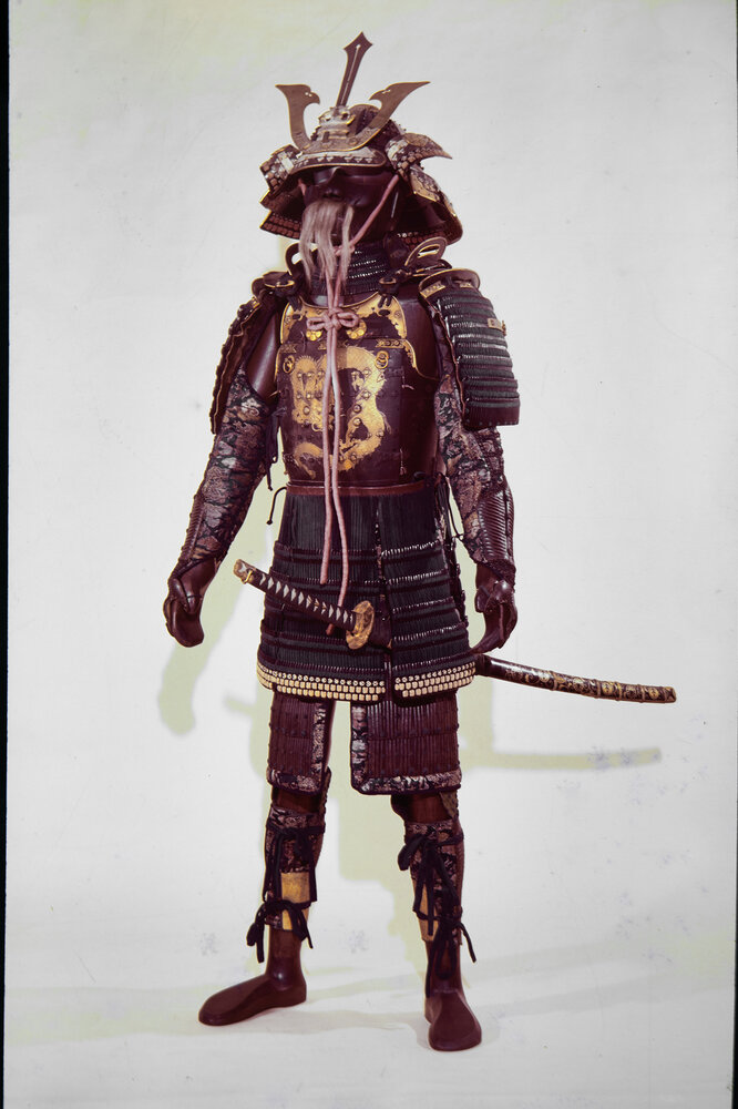 L’intera armatura riflette l’attenzione maniacale alla simbologia che caratterizzava l’epoca. Ogni dettaglio – dal drago sulla corazza ai petali di iris dell’elmo – serviva non solo a proteggere fisicamente il guerriero, ma anche a rappresentarne lo spirito e il rango. La decorazione non è puramente estetica: i motivi scelti avevano anche un significato spirituale e simbolico, conferendo al guerriero una sorta di aura protettiva. Inoltre, l’uso di materiali preziosi come il metallo dorato e la seta testimonia l’importanza dell’estetica persino in un contesto bellico. Corazza del tipo Hotoke-do, caratterizzata da una superficie liscia e compatta. Sulla corazza spicca un grande drago color oro, simbolo di forza, protezione e potere divino. Sono presenti elmo e copri nuca, maschera con crine e gli elementi di protezione per gambe e braccia. L'elmo è un Hoshi Suji kabuto con maedate mitsu kuwagata. Il coppo (hachi) è formato da lastre a forma di spicchi rivettati con margini costolati e bugne sferiche, con rivetti (shiten no byō) sulla calotta. Sulla cima del coppo è presente il foro (tehen no ana o hachimanza) con relativa ghiera ornamentale (tehen no kanamono) fiorata in ottone. Sul retro è presente una lastra piatta decorata con un bordo dorato e un gancio (agemaki no kan) con relativo nodo decorativo (agemaki). Sono presenti gli shinobi no o, lacci di corda utilizzati per fissare l’elmo al mento. La visiera (maebashi) ha cinque piccoli rivetti appuntiti e tre rivetti fiorati più grandi (sanko no byō). È presente una decorazione con motivo di petali di iris (shobu-gawa) con un inserto in pelle lavorata e come bordatura un filato di seta di colore blu, verde, bianco e oro e un bordino (fukurin) di metallo dorato ritorto su sé stesso. Infilato in un kuwagatadai, rivettato alla visiera in metallo dorato per sostenere le piatte corna kuwagata con una spada in verticale, dorato al centro del quale vi è uno tsunomoto (manca l’ulteriore maedate). Sono presenti ampi fukigaeshi con decorazione con motivo di petali di iris (shobu gawa), rivetti appuntiti decorativi, inserti di pelle scamosciata e stemma (mon) a sette cerchi concentrici all’interno di un cerchio più ampio (maru ni shichō丸に七曜), uno stemma che rappresenta una stella a cinque punte sotto forma di cerchio. Shikoro composto da tre ampie lamelle laccate, tenute assieme da lacci color rosso. La maschera è una me no shita men, a protezione della parte inferiore del viso, con baffi di crine. La protezione per la gola (yodare kake o tare) è formata da quattro lamelle ondulate tenute assieme con lacci blu cupo.