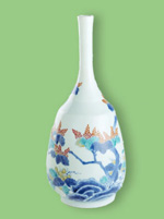 ARITA, MANIFATTURA DI NABESHIMA (?), inizio secolo XVIII Bottiglia piriforme a collo lungo con alberello di paulonia in fiore Porcellana decorata in blu sotto coperta e smalti policromi sopra coperta - a. 24.5, Ø base 8.0, Ø bocca 2.2, max largh. 10.5 (deposito) |