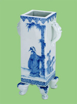 HIRADO, MANIFATTURA MIKAMACHI, metà secolo XIX Hanaike Vaso da fiori quadrangolare con cinque letterati cinesi Porcellana, blu sotto coperta, smalto nero - a. 22.2, lato 7.5 (2° galleria, vetrina 15 |