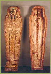 Sono rari sarcofagi come quello in cui il volto del defunto è rappresentato con l’incarnato di colore verde, per sottolineare la relazione fra il defunto ed il dio Osiride, dio della vegetazione e dell’aldilà.