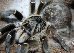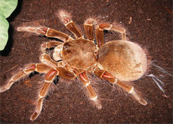 Avicularia golia Descrizione: - Dal corpo marrone con lunghi peli sulle zampe e sull'addome. - È il ragno più pesante del mondo, raggiungendo i 175 g, e può essere allevato solo da collezionisti esperti. Distribuzione e habitat: - Sud America: Suriname, Guyana, Brasile settentrionale e Venezuela meridionale, nelle foreste pluviali. Attività e comportamento: - Specie terricola, vive nascosta in profonde tane foderate di seta, in aree paludose ed acquitrinose;. - Volubile e sempre in atteggiamento di difesa del suo territorio, se provocata solleva le zampe anteriori, mostrando i cheliceri, e poi le abbassa ripetutamente sul terreno; sempre con il paio di zampe anteriori può anche emettere una stridulazione sonora. - A sviluppo mediamente veloce, le femmine possono vivere in cattività da 15 a 25 anni. - Se disturbata, piuttosto che mordere, reagisce lanciando dall'addome e dalle zampe posteriori dei peli urticanti, che possono essere pericolosi per l'uomo. Veleno: - Leggermente velenosa per l'uomo, può comunque causare allergie che si intensificano ad ogni morso, che è doloroso, viste anche le grandi dimensioni dei cheliceri (da 1,9 a 3,8 cm). |