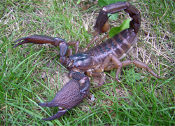 Scorpione a chele rosse della Tanzania Descrizione: - Dal corpo nero, inferiormente rossiccio, possiede chele più o meno intensamente colorate in rosso e zampe rossicce. - È uno scorpione facile da allevare e per tale motivo assai diffuso tra i collezionisti. Distribuzione e habitat: - Africa centro-orientale, in foresta pluviale tropicale. Attività e comportamento: - Specie terricola, si nasconde sotto rocce o tronchi caduti o in tane poco profonde. - Aggressiva e diffidente - Ha un ritmo di crescita medio e può vivere in cattività da 5 a 8 anni. - In genere preferisce pizzicare con le potenti chele piuttosto che pungere. Veleno: - Il veleno è leggero e non tossico per gli uomini adulti mentre è pericoloso per i bambini e per le persone allergiche (le allergie possono ovviamente intensificarsi ad ogni puntura). |