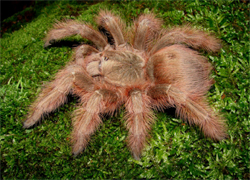 Tarantola rosa del Cile Descrizione: - Corpo da marrone scuro a nero, coperto da peli rosa o rossi. - È una specie di grandi dimensioni, tra le più diffuse tra gli allevatori ed adatta anche per quelli principianti. Distribuzione e habitat: - America meridionale: Bolivia, Cile ed Argentina, nelle zone desertiche e arbustive. Attività e comportamento: - Terricola, scavatrice opportunista, preferisce utilizzare tane già scavate da altri. - È calma, molto docile e volubile; attiva alla sera e nella notte. - Cresce ad un ritmo lento e le femmine possono vivere in cattività da 15 fino a 20 anni. - Se disturbata, piuttosto che mordere si difende lanciando peli urticanti dall'addome e dalle zampe posteriori. Veleno: - Leggermente velenosa per l'uomo, la specie è considerata estremamente docile, benché, come accade con tutte le tarantole, possa causare allergie che si intensificano ad ogni morso. |