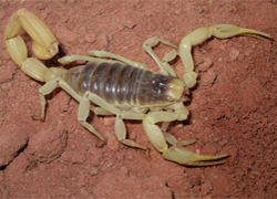 Scorpione gigante peloso del deserto Descrizione: - Giallo con la parte superiore scura. - Deve il suo nome comune ai peli marroni che coprono il suo corpo e che lo aiutano a percepire le vibrazioni nel suolo. Distribuzione e habitat: - America settentrionale, nei deserti meridionali. Attività e comportamento: - Terricolo, scava profondamente nella sabbia, da cui emerge la notte per cercare le prede ed accoppiarsi. - E' una specie dei deserti caldi, particolarmente adattata a condizioni calde e secche, molto nervosa, attiva ed aggressiva. - Le notevoli dimensioni corporee permettono a questa specie di cibarsi facilmente di altri scorpioni (casi di cannibalismo) e di una grande varietà di altre prede, comprese lucertole e serpenti. - Ha uno sviluppo medio e può vivere in cattività fino a 12 anni. Veleno: - Veleno di intensità medio forte, tossico per l'uomo; i sintomi più evidenti in chi è colpito sono la difficoltà di respirazione, l'eccessiva sudorazione e il dolore prolungato; le allergie possono intensificarsi con il ripetersi delle punture. |
